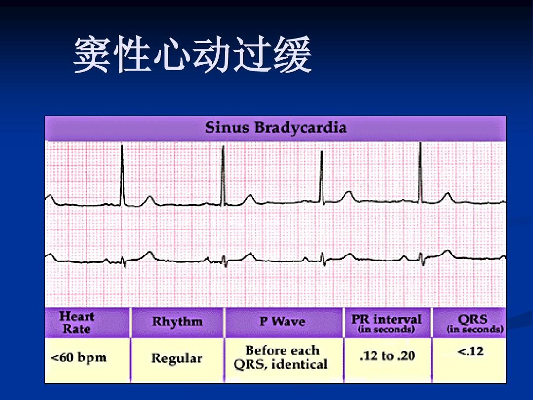窦性心动过缓:正常心脏跳动的节律称为窦性心律,其来自心脏窦房结维细胞的规律性放电,成人的放电频率一般在60~100次/分,当成人窦性心律频率低于60次/分时,称为窦性心动过缓。可见于健康的成人,尤其是运动员、老年人和睡眠状态。对于这部分心率低于60次/分,无症状的健康成人来说这不是疾病,是正常现象,只有当心跳过慢,导致心脏向全身供血不足,才会引起相应症状甚至严重后果。
