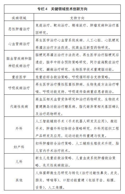 要推动关键领域技术创新,支持相关专科在影响人民健康的重大疾病和再生医学、精准医疗、脑科学、 人工智能、生物医学等关键技术领域进行创新,通过与大学、 研究单位合作等形式加强复合型创新团队建设,争取解决一批“卡脖子”技术,形成一批国际领先的原创性技术,推动相关专科能力进入国际前列。