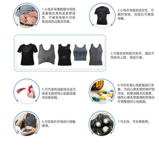 智能心电衣设备可以采集、记录并实时监测用户在工作、生活等不同状态下的12导联动态心电图,支持水洗、可长期使用。