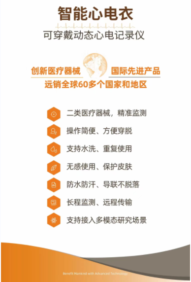 智能心电衣设备可以采集、记录并实时监测用户在工作、生活等不同状态下的12导联动态心电图,支持水洗、可长期使用。
