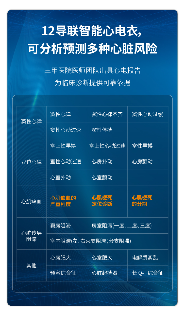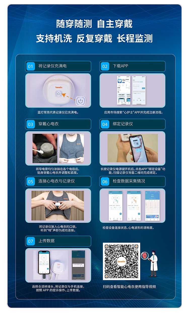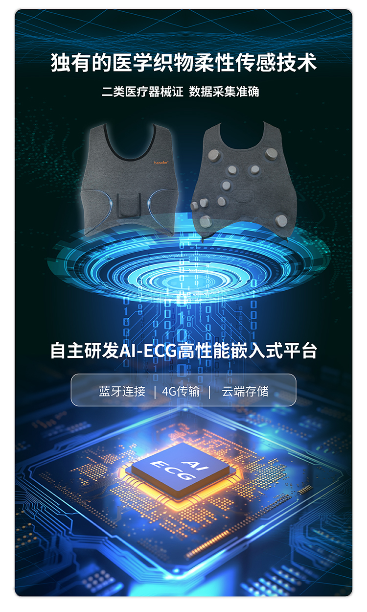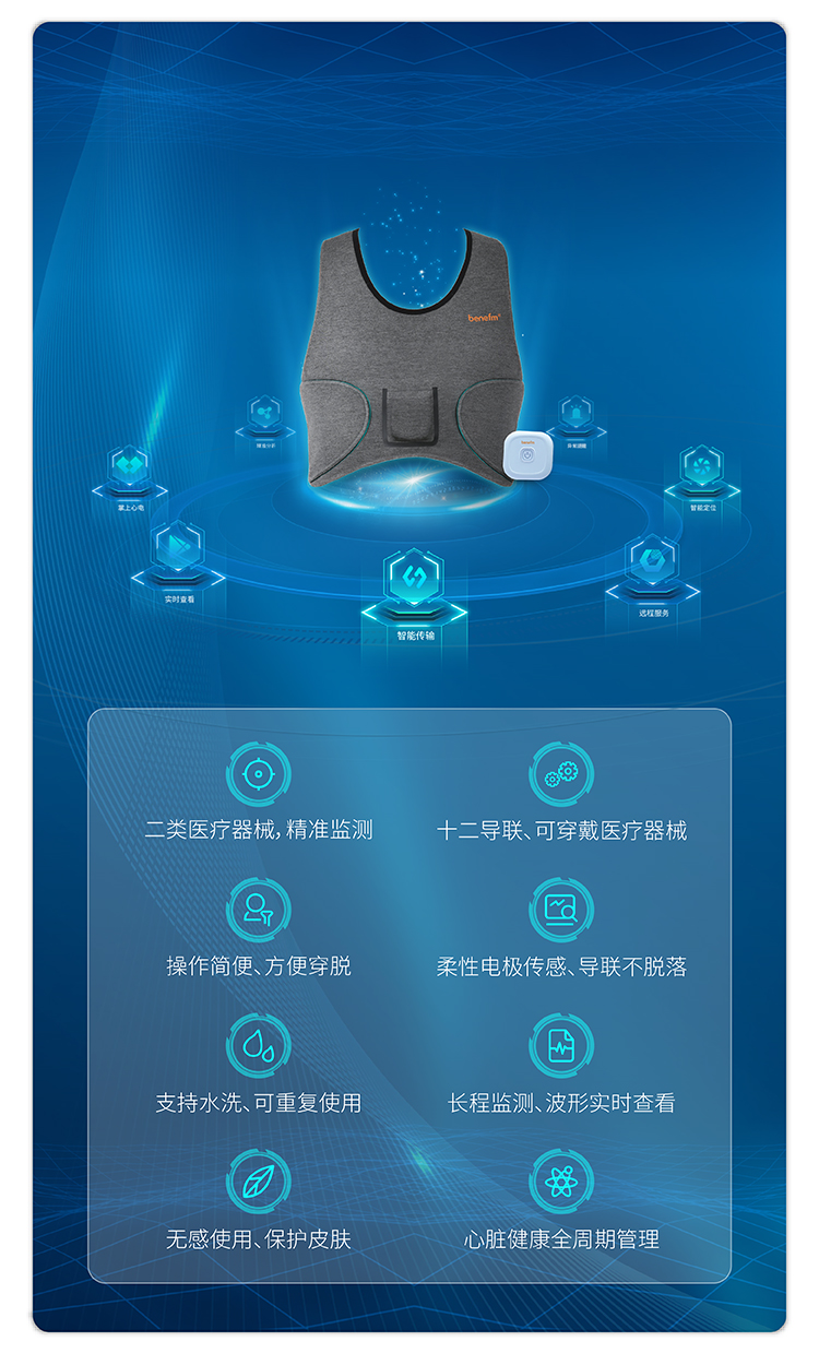 智能心电衣设备可以采集、记录并实时监测用户在工作、生活等不同状态下的12导联动态心电图,支持水洗、可长期使用。