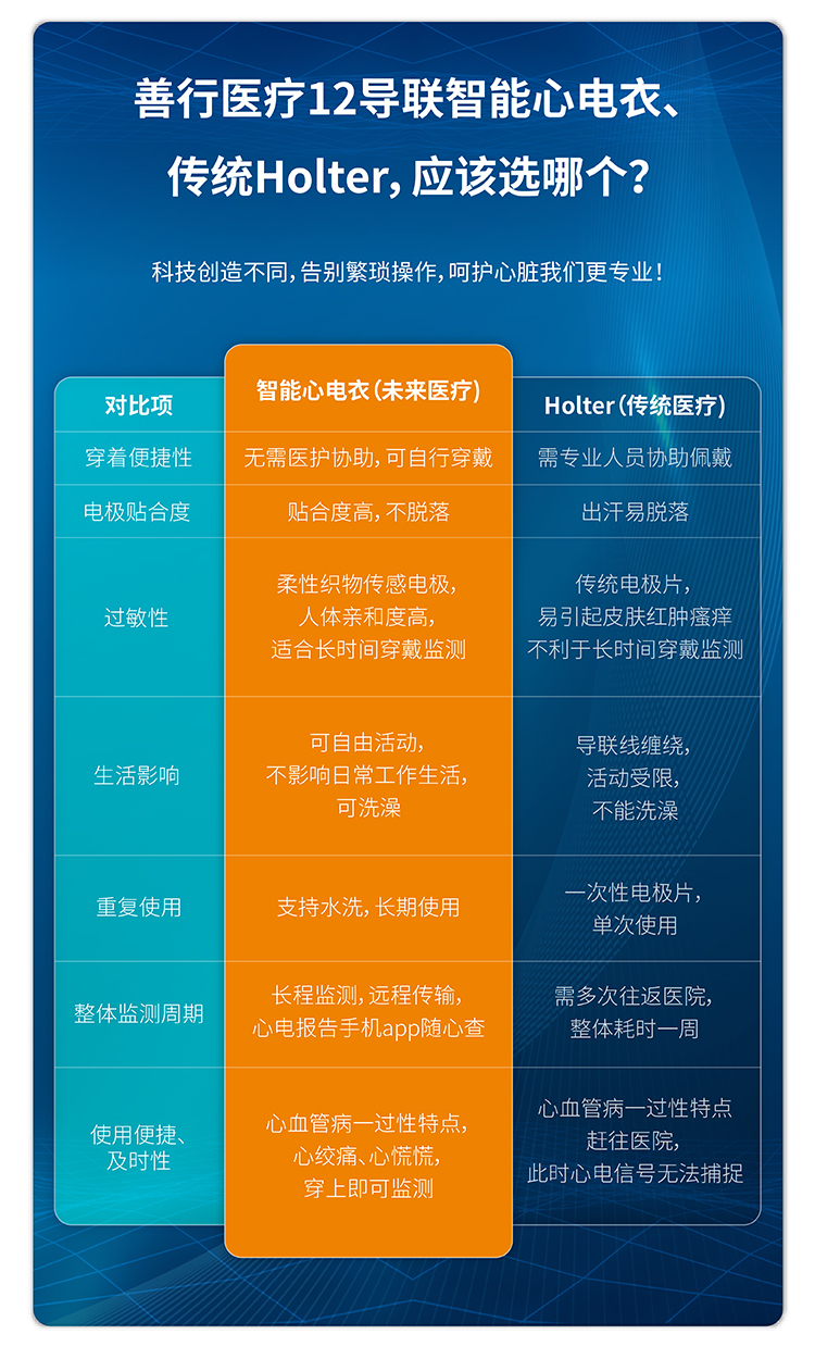 不同于传统医院内的动态心电图检查设备,智能心电衣的穿戴操作简单,不需依赖专业医生指导,用户可独立完成穿戴使用。依托善行医疗创新智造的“柔性织物电极”,智能心电衣在保证数据采集达到临床医学认可信度的同时,打造了亲肤无感的全新心电监测体验。革命性地将传统心电信号采集场所由医院内转移到医院外,让更多的人足不出户,就能享受专业、可信赖的心电监测及医疗服务。