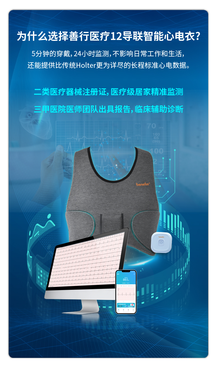 智能心电衣,即“十二导联可穿戴动态心电记录仪”,是由深圳市善行医疗科技有限公司自主研发的创新医疗器械,已获得国内二类医疗器械注册证。
