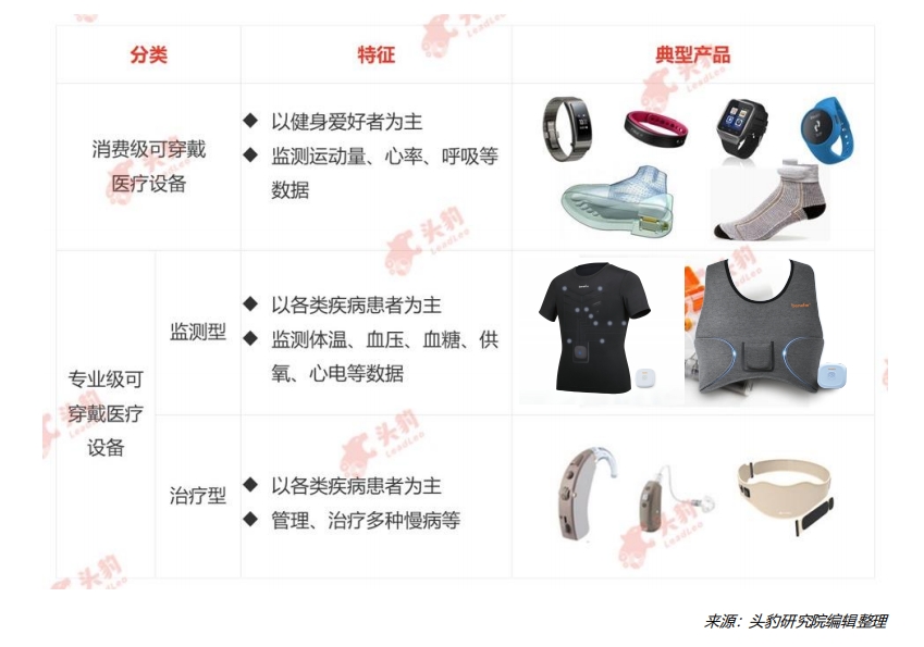 (2)专业级可穿戴医疗设备: 专业级可穿戴医疗设备以各类疾病患者为目标用户,根据功能差异分为两类:一类是监测型可穿戴医疗设备,主要用于监测人体体温、血压、血糖、血氧、心电等数据,为医生诊断提供依据,典型的产品有血糖手表及智能心电衣等;另一类为治疗型可穿戴医疗设备,如可预防心脏室性心律失常的可穿戴心率除颤器、可缓解背部疼痛的可穿戴背部治疗设备等。