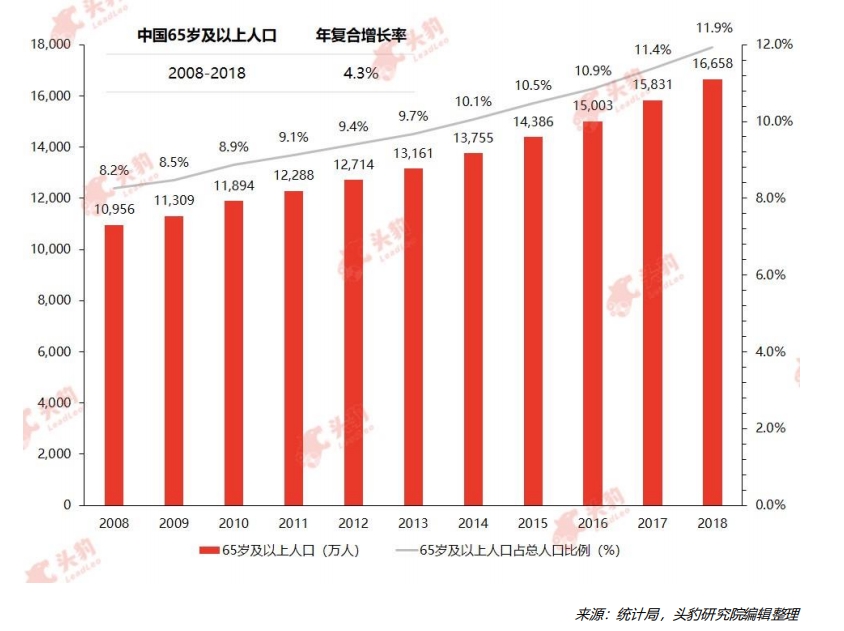 (1)中国老龄化程度持续加深,老龄人口规模庞大。统计局数据显示,2008-2018 年中国 65 岁及以上老年人口规模从 10,956 万人增加到 16,658 万人,占总人口比例从 8.2%上升 到 11.9%,65 岁及以上老年人口规模年复合增长速度 4.3%(见图 3-1)。根据 2001 年联 合国发布的《世界人口老龄化报告(1950-2050 年)》分类标准,将 65 岁及以上老年人口 比例超过 7%、14%和 20%的国家或地区,分别定义为老龄化社会、老龄社会和高龄社会, 中国已经处于老龄化社会,并向老龄社会发展。
