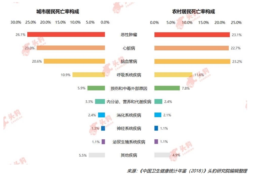 (2)慢病严重影响居民健康与生活质量,慢病管理市场需求广泛存在。从慢病特征来看,慢病起病于遗传、生理、环境和行为等多种因素,具有起病隐匿、病程长且难以治愈的特点, 慢病涉及疾病种类繁多,主要包括心脑血管疾病、精神疾病、糖尿病等,慢病患者群体规模庞大。从慢病死亡率来看,《中国卫生健康统计年鉴(2018)》数据显示,2017 年中国心脏病和脑血管疾病死亡人数占总死亡人数比例分别达 23.0%、20.6%,仅次于恶性肿瘤位列第 二、第三,且呈现逐年上涨趋势,慢病死亡率整体处于较高水平。