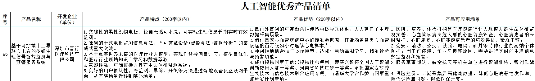 为加大人工智能创新产品和应用场景的供需对接力度,宣传推广人工智能应用标杆案例,持续打造全域全时应用场景,6月21日,深圳市工业和信息化局发布了《人工智能优秀产品清单》与《人工智能典型应用案例清单》。善行医疗“基于可穿戴十二导联心电衣的多维生理信号智能监测与预警服务系统”产品、“基于可穿戴AI诊疗设备的心血管病智能筛查与健康管理”项目成功入选!