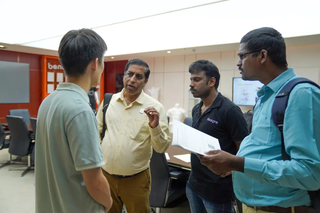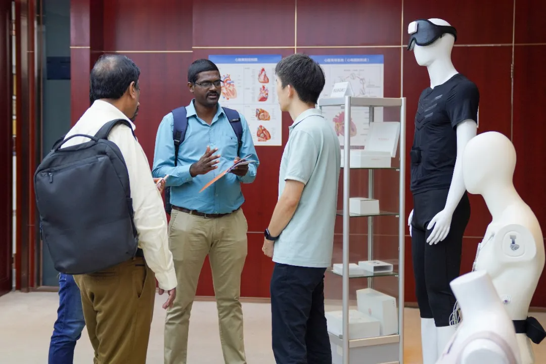 在参观过程中,LifeSigns Medtech CTO详细了解了善行医疗产品的技术特点、性能指标和应用场景,特别关注了这些产品在临床级精度、舒适性和长期监测稳定性方面的表现。
